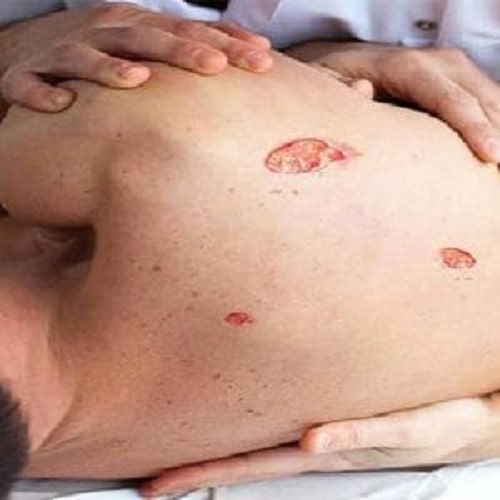زخم از طریق پوست ترک خورده و شکسته شده تا لایه های عمیق تر بافت پوست گسترش می یابد. زخم دهانه مانند وجود دارد و این زخم مستعد عفونت است.